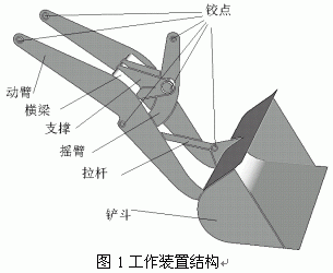 裝載機的工作裝置的任務(wù)是鏟掘和裝卸物料,有前卸式和回轉(zhuǎn)式兩種機型。其工作裝置由鏟斗、動臂、搖臂、連桿(或托架)、轉(zhuǎn)斗油缸、動臂油缸和車架等組成。