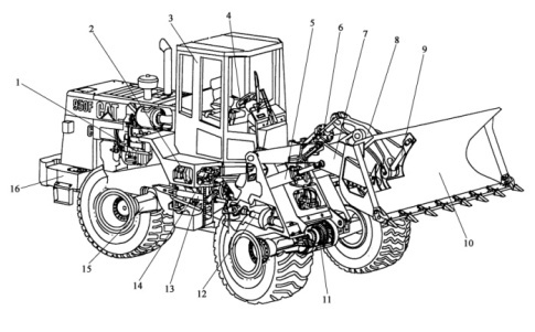 1-發(fā)動機;2-變矩器;3-駕駛室;4-操縱系統(tǒng);5-動臂油缸;6-轉(zhuǎn)斗油缸;7-動臂;8-搖臂;9-連桿;10-鏟斗;11-前驅(qū)動橋;12傳動軸;13-轉(zhuǎn)向油缸;14-變速器;15-后驅(qū)動橋;16-車架