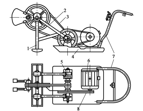 1-夯頭;2-夯架;3、8-三角帶;4-底盤;5-傳動軸架;6-電動機; 7-扶手
