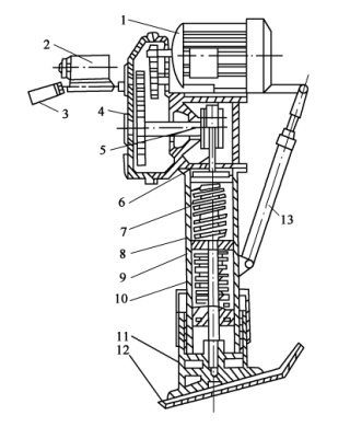1-電動機;2-電氣開關;3-操縱手柄;4-減速器;5-曲柄;6連桿;7-內套筒;8-機體;9-滑套活塞;10-螺旋彈簧組;11底座;12-夯板;13-減振器支承器