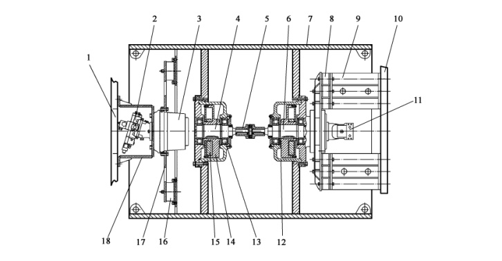 1-前車架左側(cè)框板;2-行走馬達(dá);3-行走減速器;4-左振動(dòng)軸;5-聯(lián)軸器;6-右振動(dòng)軸;7-振動(dòng)輪體;8-減振塊;9-右連接支架; 10-前車架右側(cè)框板;11-振動(dòng)馬達(dá);12-軸承;13-箱體;14-固定偏心輪;15-活動(dòng)偏心輪;16-減振塊;17-行走減速器固定板; 18-左連接支架