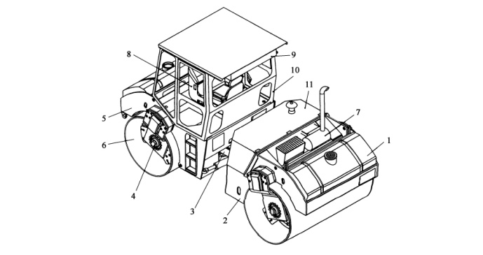 1-灑水系統(tǒng);2-后車架;3-中心鉸接架;4-液壓系統(tǒng);5-前車架;6-振動(dòng)輪;7-動(dòng)力裝置;8-操縱臺(tái)總成;9-空調(diào);10-駕駛室; 11-覆蓋件