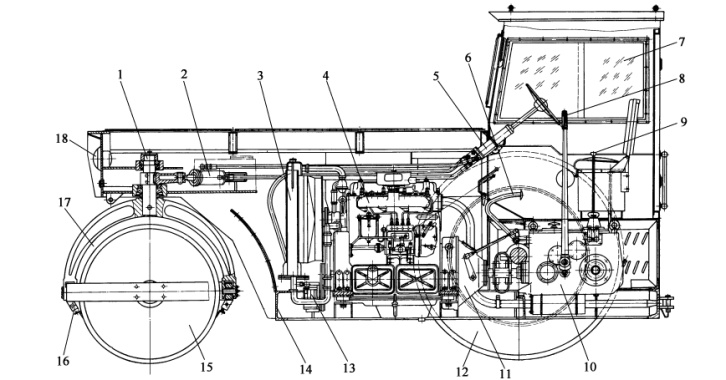 YL26輪胎壓路機由車架11、發動機13、減速器6、后驅動橋7、前輪總成15、后輪總成10、灑水系統9、操作系統3、轉向系統14、液壓系統 5和6、電氣系統 18等組成。