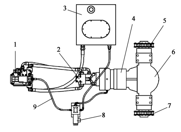 1-液壓泵;2-液壓馬達;3-液壓油箱;4-行走減速器;5-右鏈輪組;6-后驅動橋;7-左鏈輪組;8-制動閥;9-油管