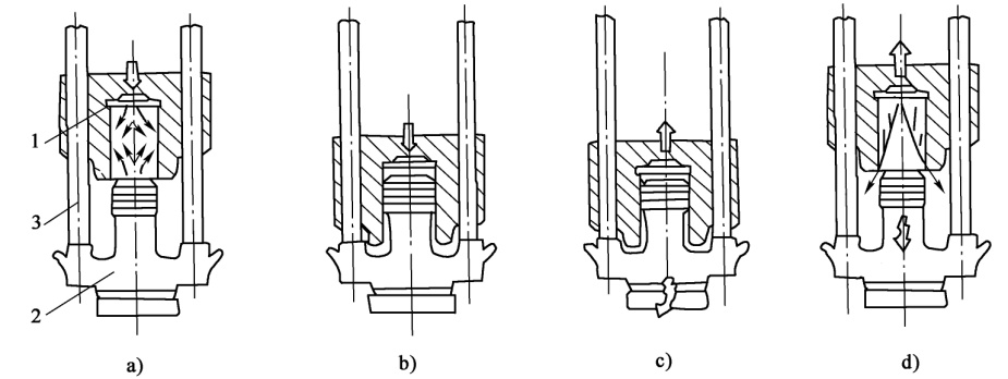 a) 壓縮;b)供油;c)燃燒;d)排氣、吸氣