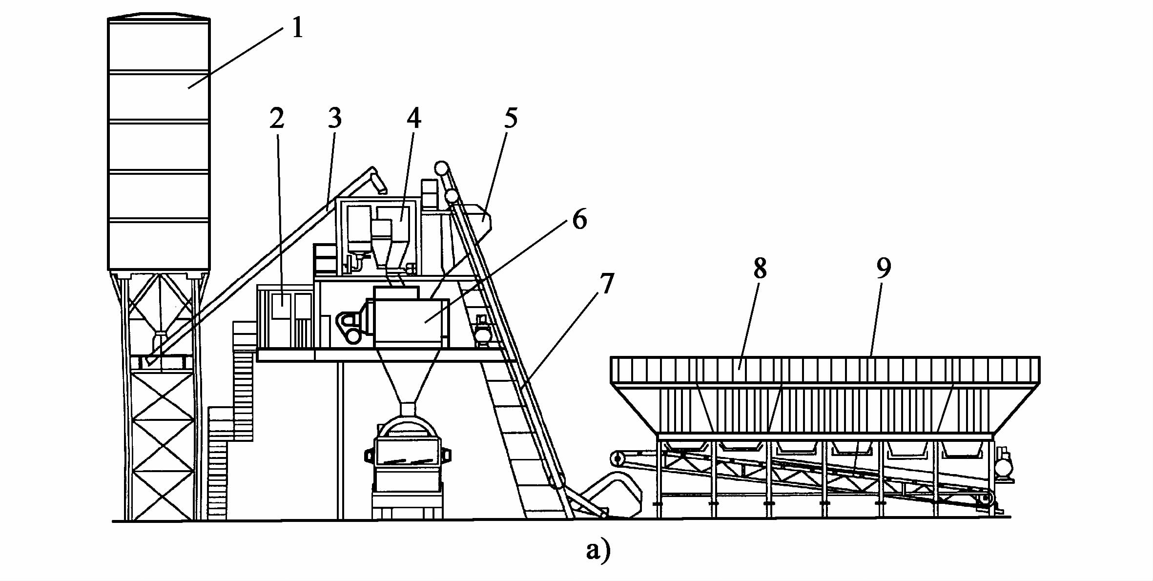 1水泥筒倉;2控制系統;3螺旋輸送機;4配料斗;5斗式提升機;6攪拌系統;7上料導軌;8集料倉;9皮帶輸送機(皮帶秤)
