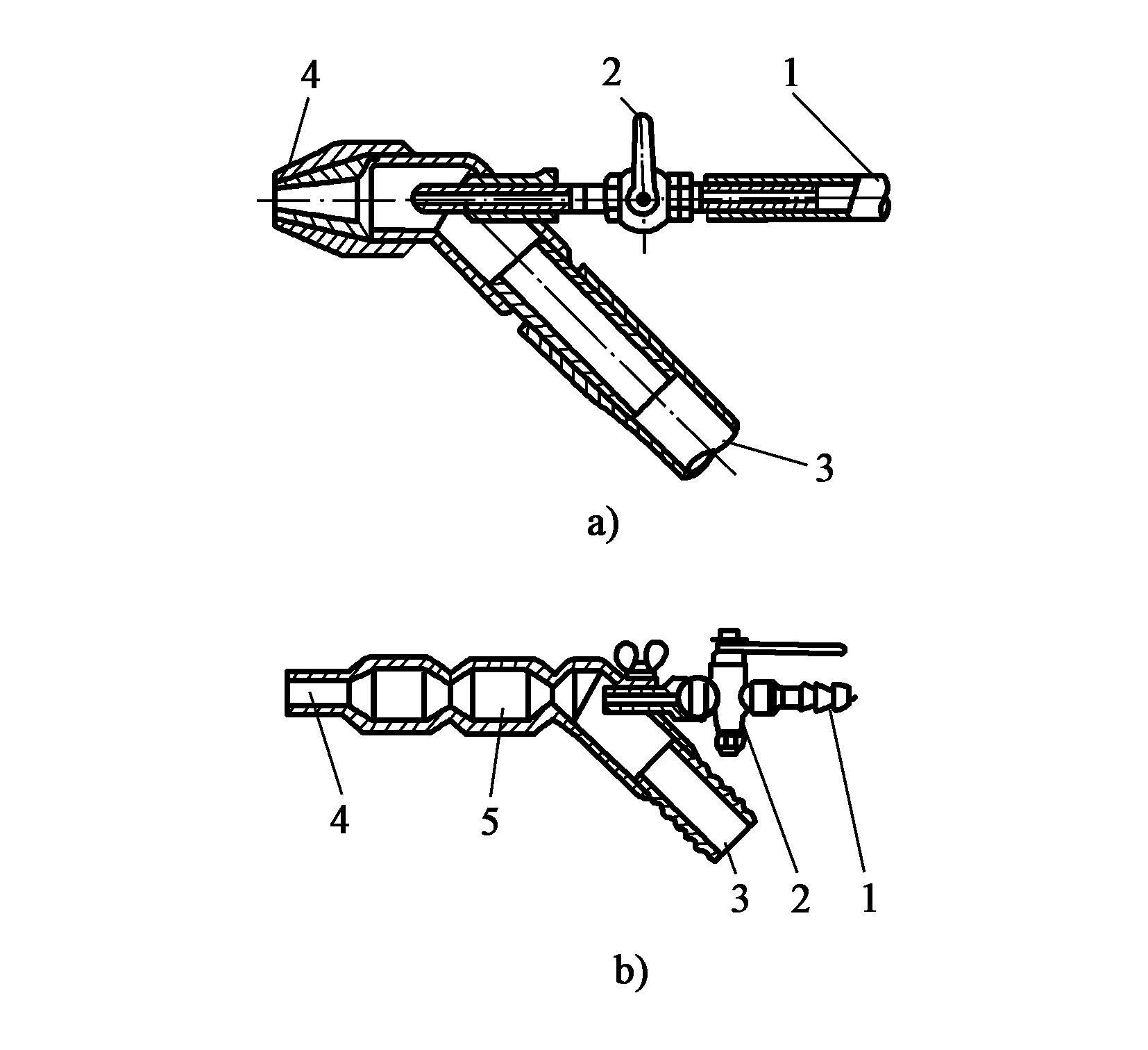 灰漿噴槍是灰漿泵的配套機具,泵送來的灰漿通過它噴涂到墻面上,是灰漿噴涂機械不可缺少的組成部分。常用的灰漿噴槍有普通噴槍和萬能噴槍兩種,其結構如圖6-7所示。普通噴槍用來噴涂石灰灰漿,它是一個成錐形口的套管,下接輸漿管,壓縮空氣沿輸氣管進入錐形口的空間,壓縮空氣噴出時,帶動周圍灰漿從錐形口一起噴出,并由開關控制輸氣量的大小。萬能噴槍用來噴涂混合灰漿(石灰水泥灰漿或石灰石膏灰漿),它由三段錐形管組成,灰漿由輸漿管送入,壓縮空氣沿輸氣管進入,由于錐形管之間的空間減小,可以使壓縮空氣和灰漿很好地混合,輸氣量也由開關來控制。