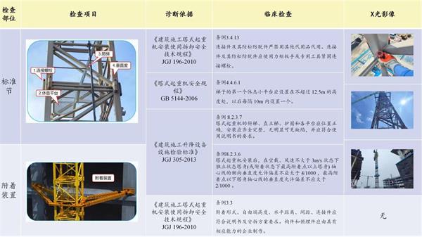 1、《建筑施工塔式起重機安裝使用拆卸安全技術規程》JGJ 196-2010條例3.4.13 ,連接件及其防松防脫件嚴禁使用其他代用品。連接件及其防松防脫件應使用力矩扳手或專用工具緊固連接螺栓。2、《塔式起重機安全規程》GB 5144-2006條例4.4.6.1,梯子的第一個休息小平臺應設置在不超過12.5m的高度處,以后每隔10m內設置一個。3、《建筑施工升降設備設施檢驗標準》JGJ 305-2013條例 8.2.3.7,塔式起重機的斜梯、直立梯、護圈和各平臺應位置正確,安裝應齊全完整,無明顯可見缺陷,并應符合使用說明書的要求。4、《建筑施工升降設備設施檢驗標準》JGJ 305-2013條例8.2.3.6,塔式起重機安裝后,在空載、風速不大于 3m/s 狀態下獨立狀態塔身(或附著狀態下最高附著點以上塔身) 軸心線的側向垂直度允許偏差不應大于 4/1000,最高附著點以下塔身軸心線的垂直度允許偏差不應大于 2/1000。《建筑施工塔式起重機安裝使用拆卸安全技術規程》JGJ 196-2010條例3.3,附著形式、自由端高度、水平距離、間距、連接件應符合說明書及安拆方案要求。構件和預埋件應由具有相應能力的企業制作。1、《建筑施工升降設備設施檢驗標準》JGJ 305-2013條例 8.2.9,安全溢流閥、平衡閥、液壓鎖、泵站系統應無泄漏、連接牢固符合說明書要求。2、《塔式起重機安全規程》GB 5144-2006條例6.11,自升式塔機應具有防止塔身在正常加節、降節作業時,頂升橫梁從塔身支承中自行脫出的功能。1、《建筑施工塔式起重機安裝使用拆卸安全技術規程》JGJ 196-2010條例3.4.12,塔式起重機的安全裝置必須齊全,并應按程序進行調試合格。2、《塔式起重機安全規程》GB 5144-2006條例4.6.4,司機室內應配備符合消防要求的滅火器。1、《建筑施工升降設備設施檢驗標準》JGJ 305-2013條例8.2.3,結構件、連接件的安裝應符合使用說明書的要求。2、《塔式起重機安全規程》GB 5144-2006條例6.9,小車變幅的軌道行程末端需設置止擋裝置。緩沖器安裝在止擋裝置或變幅小車上,當變幅小車與止擋裝置撞擊時,緩沖器應使變幅小車較平穩地停車而不產生猛烈的沖擊。1、《塔式起重機安全規程》GB 5144-2006條例4.4.3,平臺和走道寬度不應小于500mm,局部有妨礙處可降至400mm。2、《塔式起重機安全規程》GB 5144-2006條例4.4.4,平臺或走道應設置不小于100mm踢腳板。3、《建筑施工升降設備設施檢驗標準》JGJ 305-2013條例8.2.3,平衡重的質量、數量、位置與臂長組合及安裝應符合使用說明書的要求,平衡重吊點應完好。《建筑塔式起重機安裝使用拆卸安全技術規程》JGJ 196-2010條例4. 0.16 ,當塔式起重機使用高度超過 30m 時,應配置障礙燈,起重臂根部鉸點高度超過 50m 時應配備風速儀。1、《建筑塔式起重機安裝使用拆卸安全技術規程》JGJ 196-2010條例6.3.4,滑輪有下列情況之一的應予以報廢:4)鑄造滑輪槽底磨損達鋼絲繩原直徑的 30% ;焊接滑輪槽底磨損達鋼絲繩原直徑的 15%。2、《建筑塔式起重機安裝使用拆卸安全技術規程》JGJ 196-2010條例6.3.2,吊鉤嚴禁補焊,有下列情況之一的應予以報廢:1、《塔式起重機》GB/T 5031-2019條例5.4.1.7.2,卷筒兩端均應有側板,在達到最大設計許用容繩量時,側板外緣高度超出纏繞鋼絲繩外表面應不小于2倍鋼絲繩直徑;容繩量的設計應保證在最大起升高度時,吊鉤下降到最低位置狀態,卷筒上應存有不少于3圈安全圈。2、《起重機鋼絲繩保養維護檢驗和報廢》GB/T 5972-2016條例6 ,報廢基準:可見斷絲、鋼絲繩直徑減小、斷股、腐蝕、畸形和損傷。《塔式起重機》GB/T 5031-2019條例5.6.4,回轉處不設集電器供電的塔機,應設置正反兩個方向回轉限位開關,開關動作時臂架旋轉角度應不大于±540°。《塔式起重機》GB/T 5031-2019條例5.6.1.2,小車變幅的塔機,吊鉤裝置頂部升至小車架下端的最小距離為800mm處時,應能立即停止起升運動,但應有下降運動。《塔式起重機》GB/T 5031-2019條例5.6.2.2,小車變幅的塔機,應設置小車行程限位開關和終端緩沖裝置。限位開關動作后應保證小車停車時其端部距緩沖裝置最小距離為200mm。《塔式起重機》GB/T 5031-2019條例5.6.6.4,當起重量大于最大額定起重量并小于110% 額定起重量時,應停止上升方向動作,但應有下降方向動作。《塔式起重機》GB/T 5031-2019條例5.6.6.1,當起重力矩大于相應幅度額定值并小于額定值110%時,應停止上升和向外變幅動作,但應有下降和內變幅動作。