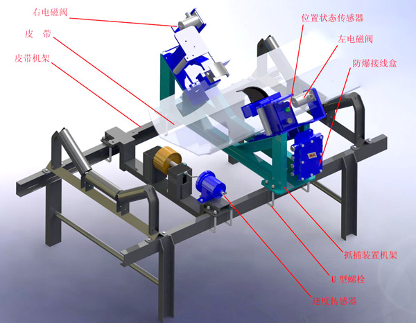 抓捕皮帶的執行機構為一組左、右對稱的敞開式凸輪壓帶方式,體積小,結構緊湊。抓捕皮帶的夾緊力隨著皮帶下滑位移的增大而增加。